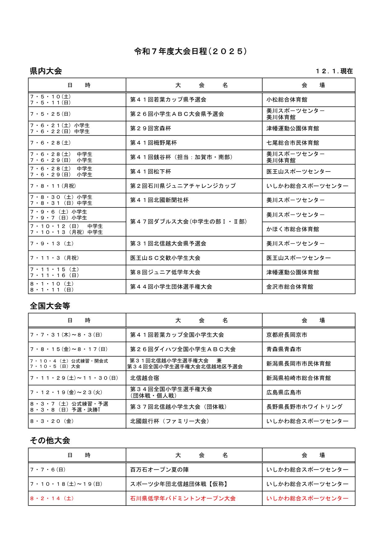 大会日程・・2/20現在 決まり次第、ご連絡致します